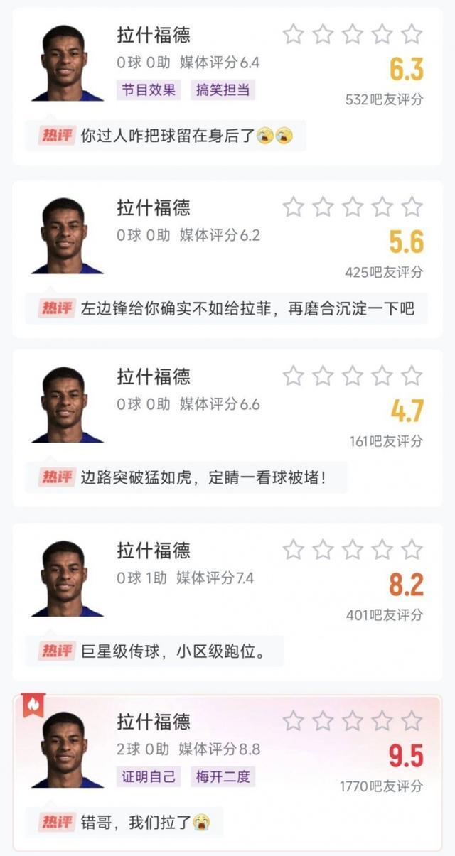 拉什福德巴萨5场比赛评分,从上至下分别是西甲1-4轮和欧冠首轮