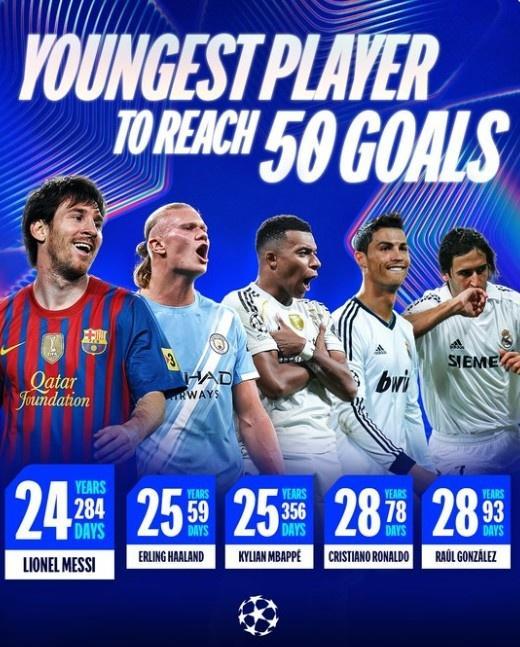9月26日讯 对阵那不勒斯的欧冠联赛阶段比赛,哈兰德打进1球成功解锁欧冠50球里程碑。但是,哈兰德并不是欧冠历史打进50球最年轻球员,阿根廷传奇梅西保持着这一纪录。