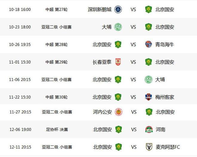 国安接下来回联赛扮演“生死判官”!10月18日联赛第27轮,客战深圳新鹏城,10月23日亚冠二级第三轮客战大埔,10月26日联赛第28轮,主场迎战青岛海牛,11月1日第29轮客战长春亚泰,11月6日,亚冠二级第四轮,主场和大埔进行背靠背比赛,11月22日联赛末轮,主场迎战梅州客家。