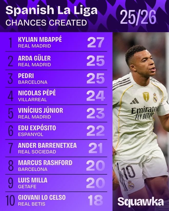 - 西甲 | 本赛季西甲创造机会最多榜:姆巴佩27次,居莱尔佩德里25次第二