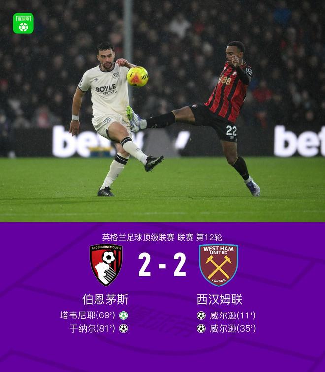 伯恩茅斯22西汉姆联,威尔逊双响,于纳尔扳平比分