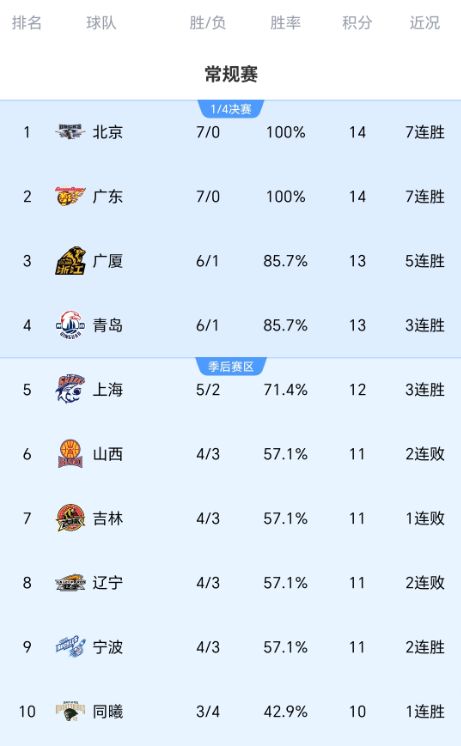广东男篮VS山西男篮的对决非常激烈,前三节,广东队领先18分情况下,最后一节差一点遭到山西队的翻盘,比分15-27输掉12分,最终95-89有惊无险获胜,将连胜场次扩大到七场。这个比赛日结束之后,最新积分榜如下——